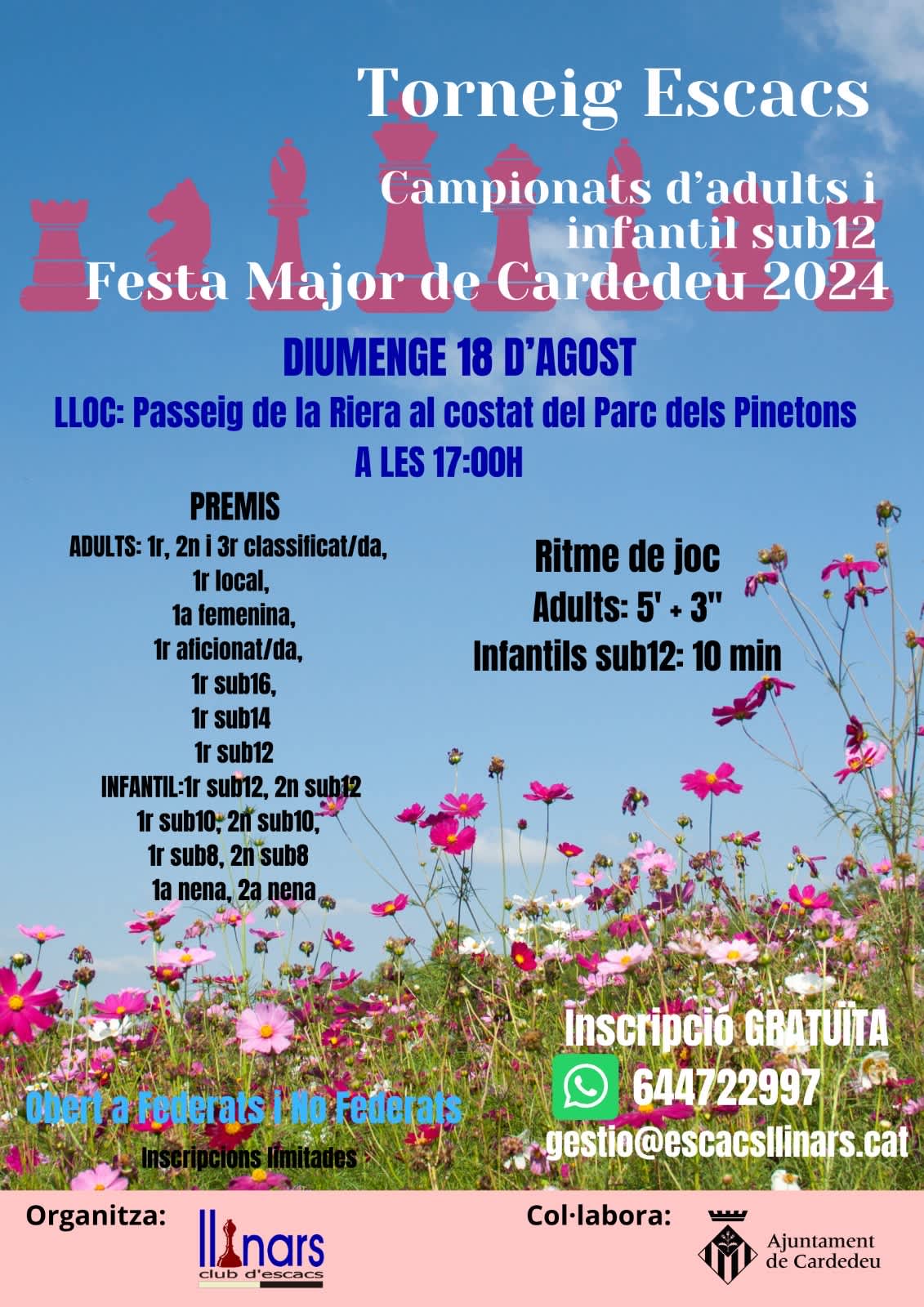 Campionat d'escacs d'adults i infantil sub12. El torneig es farà al Passeig Mestre Alexandri, al costat del Parc dels Pinetons.